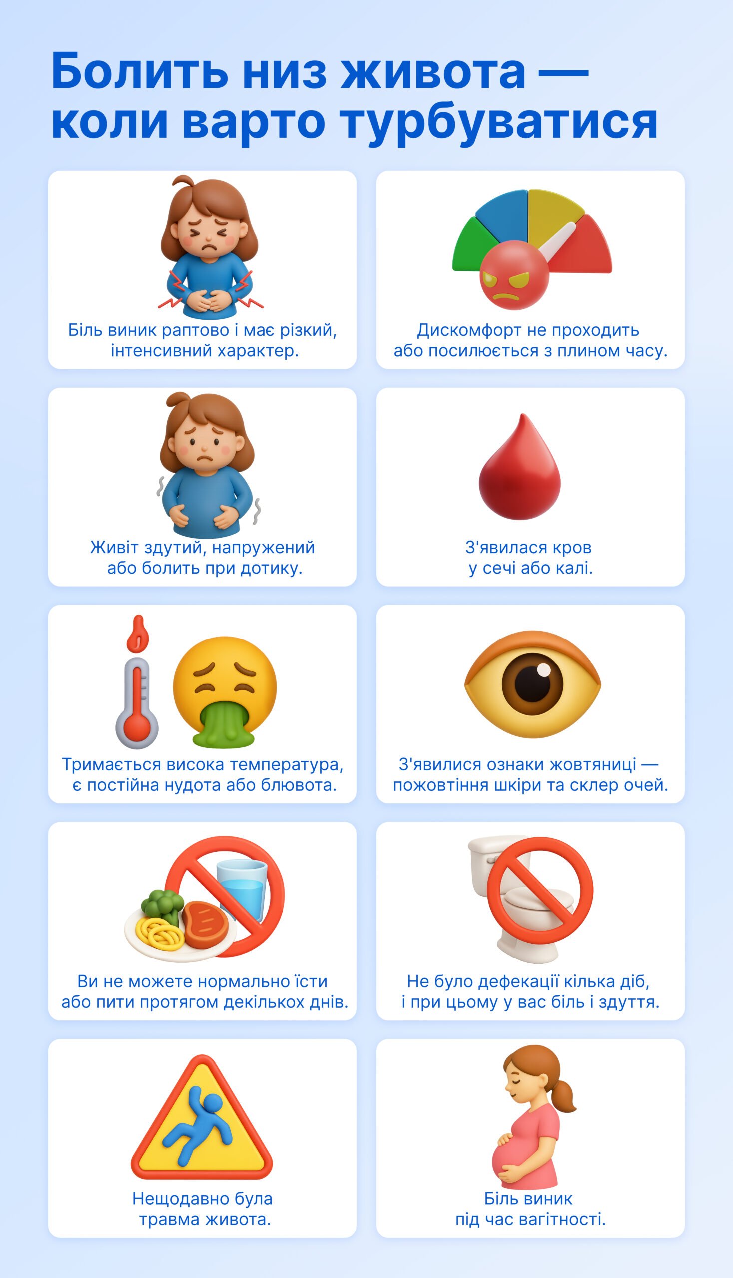 • Біль з іншими симптомами: підвищена температура, кровотеча чи запаморочення можуть свідчити про ускладнення.