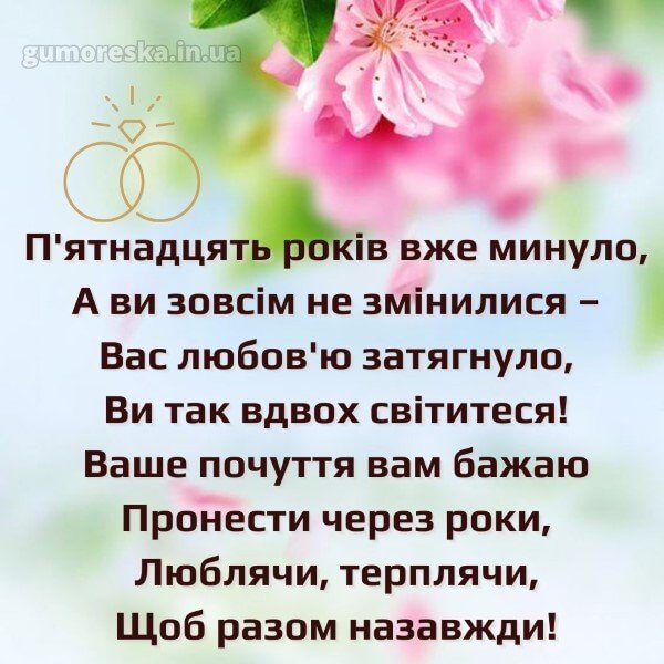 Дорогі молодята! 15 років сімейного життя зробили вас ще щасливішими і молодшими. Ви — приклад любові та взаємоповаги, виховання розумних, чуйних, добрих дітей, які цінують своїх батьків. Дякуємо вам за ту любов, щастя і радість, які ви даруєте не тільки одне одному, але і оточуючим. Нехай у ваше життя входить як можна більше задоволення і позитиву!
