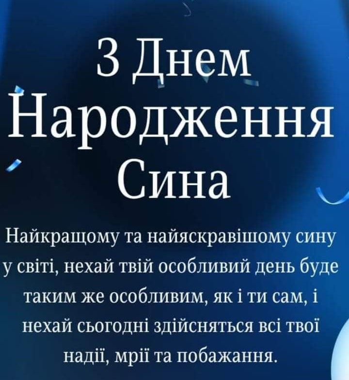 Дорогий мій син, рідна моя кровиночка — бажаний і самий улюблений в світі! Вітаю тебе з днем народження, щиро обіймаю і цілую, ненаглядний мій! Бажаю, щоб у твоєму житті завжди було світло, і добро, людське розуміння і теплота серця! Нехай успіх завжди йде поруч з тобою, а удача приходить у найважчі хвилини! Хай береже тебе моя любов! Люби і будь любимим! Щастя тобі і здоров’я!