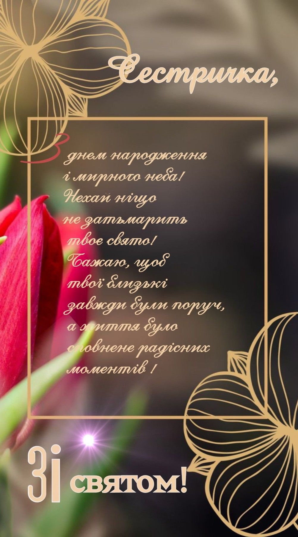 Сестричка, з днем народження. Завжди залишайся такою ж милою, чарівною, ніжною, доброю, красивою. Нехай всі неприємності, обходять тебе стороною, а ти даруй людям свою променисту посмішку. Будь цілеспрямованою, наполегливою, і всі твої мрії обов’язково збудуться. Не сумнівайся, ти будеш найщасливішою. Я тебе люблю!