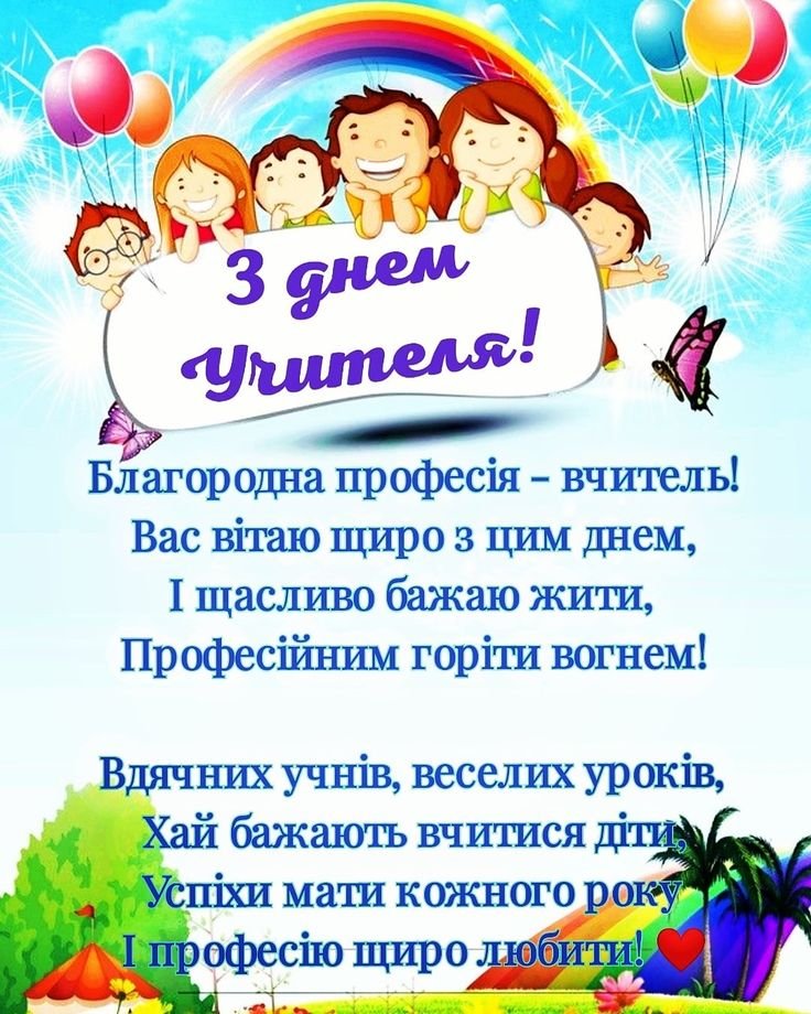 Шановні Педагоги! Вітаємо вас зі Всесвітнім днем вчителя і бажаємо вам найкращого настрою протягом всього року. Нехай ваші учні радують вас своїми успіхами, а сімейне життя буде надійним оплотом, тихою приємною гаванню, куди приємно повертатися після складного робочого дня. Міцно обіймаємо вас і дякуємо за знання та доброту, якими ви обдарували нас, своїх учнів.