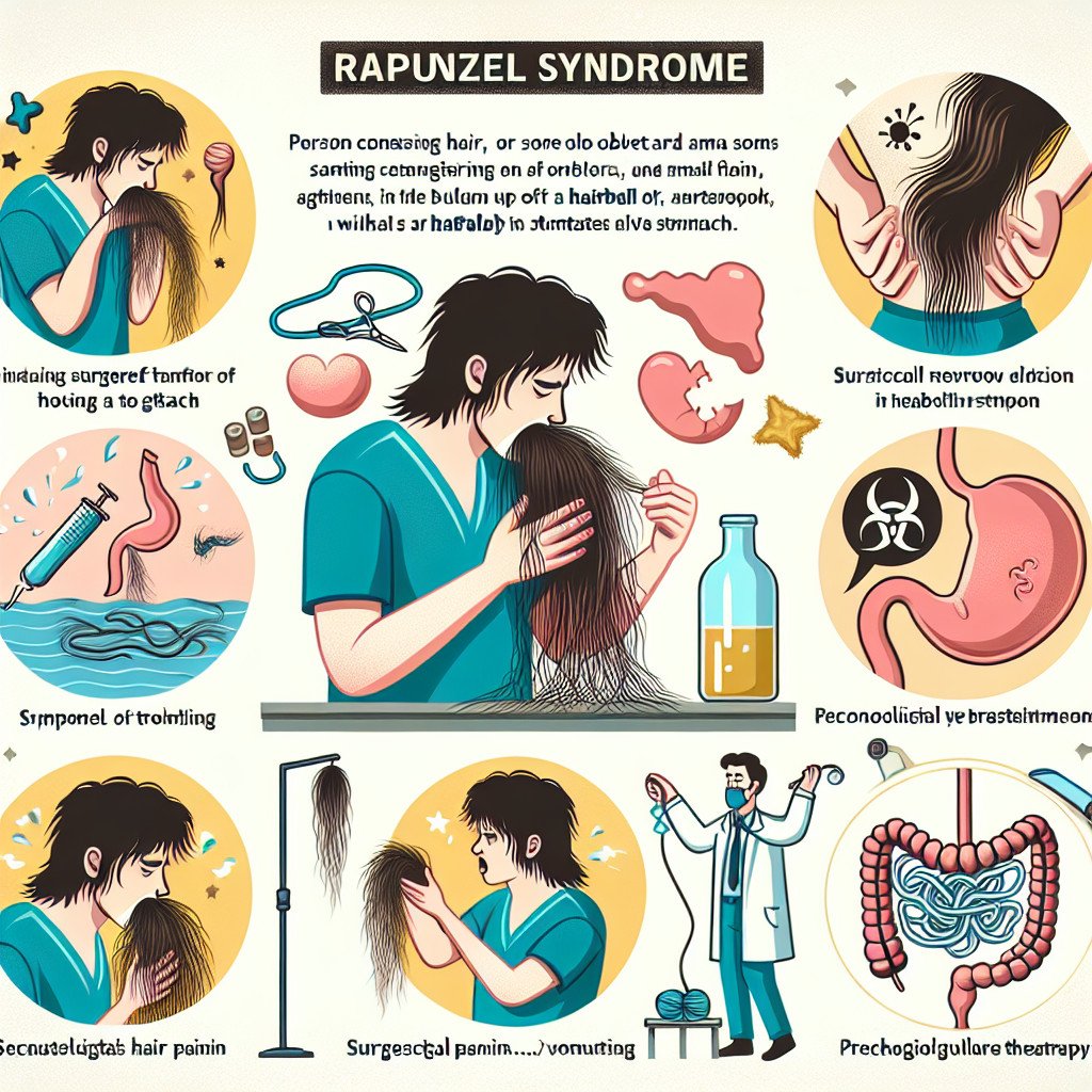 Синдром рапунцель — це доволі рідкісне й ексцентричне захворювання, яке вражає здебільшого людей із психічними розладами. Суть проблеми — в наявності трихобезоара, або ж волосся в шлунково-кишковому тракті, яке утворюється через звичку їсти власне волосся. Назва походить від відомої казки братів Грімм про дівчинку з довгим косами. Маленька ілюстрація наявності краси лише зовні, без глибокого розуміння, як це виглядає насправді всередині.