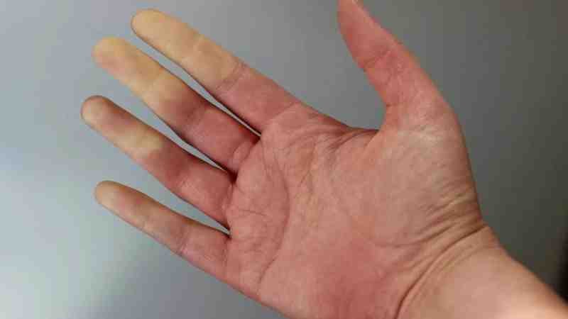 А тепер подивимось на симптоми. Пальці перетворюються на живопис. Спочатку білі – через брак кровообігу. Тоді сині – кисень закінчується і, нарешті, червоні, коли кровопостачання знову відновлюється. Болісно? Ще б пак! Ще й як!