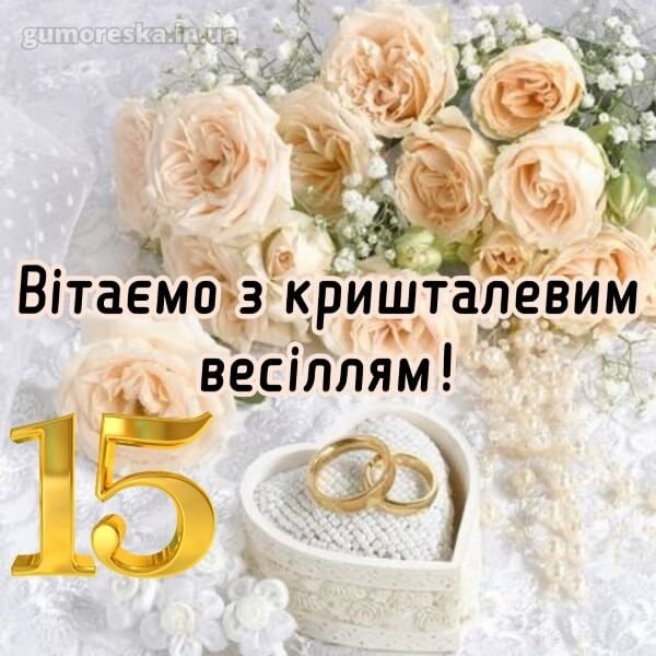 Вам сьогодні 15 років, вітаю з кришталевим весіллям. Від усього серця бажаю, щоб якщо і були сльози, то тільки від радості, якщо спогади, то тільки світлі і добрі, якщо веселощі, то для всієї родини, якщо щастя, то кришталево чистого і незламного.