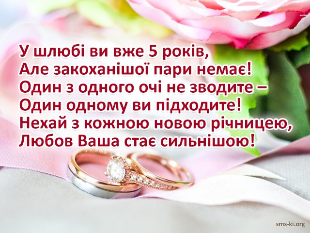 Вітаємо люблячу пару з річницею — 5 років з дня весілля! Бажаємо — світла і щастя, любові і достатку, ніжності і розуміння, єднання і терпіння. Нехай ваша сім’я буде міцною і надійною, як тисячолітні дерева, міцно тримаючись корінням за сімейні цінності та ідеали!