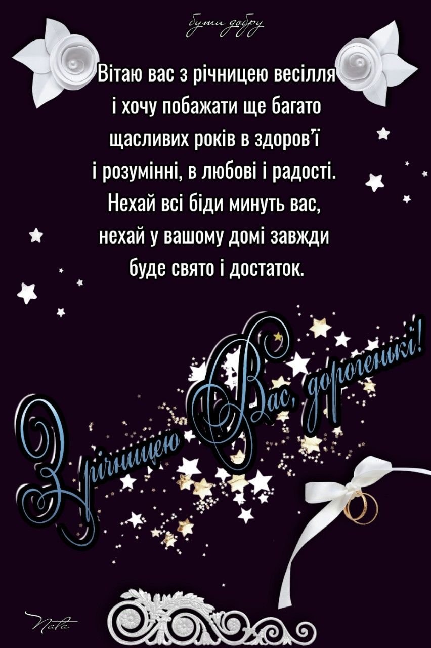 Вітаю вас, дорогі, з вашою річницею, з успішно пройденим етапом ваших відносин. Бажаю незгасної любові і щирих взаємних почуттів. Нехай ваша спільна дорога освітлюється щастям і благополуччям, нехай не буде на ній життєвих перешкод.