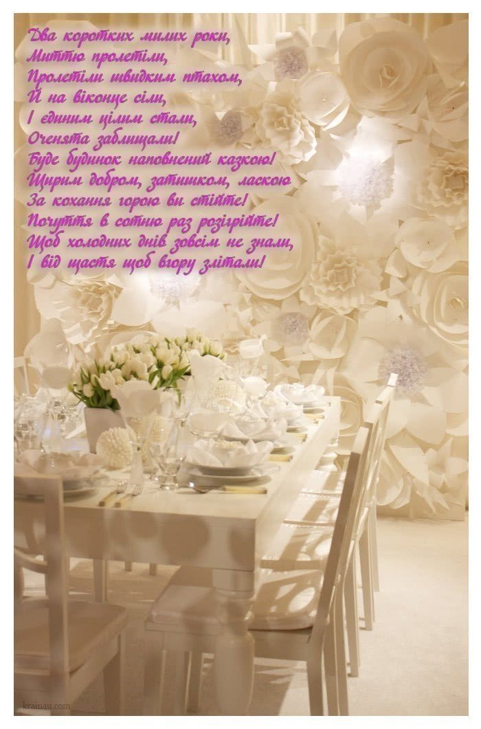 Вітаю вас з паперовим весіллям. Ви добре прожили ці 2 роки, зуміли подолати всі труднощі і біди. Нехай з цього дня почнеться райдужна смуга для вашої родини, хай ваша любов допоможе впоратися з будь-якою справою, нехай ваші серця б’ються в унісон в ритмі щастя і натхнення.