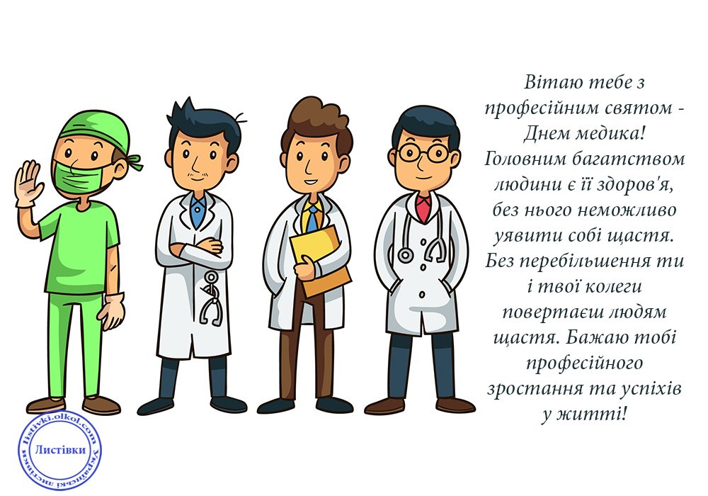 Вітаю з Днем медика. Бажаю життя без уколів з боку близьких людей, без серцевих ран і травм душі. Нехай кожен день дарує посмішки вдячності пацієнтів, приємні сюрпризи від коханих, радісні новини та неймовірні сили для звершення усіх планів.