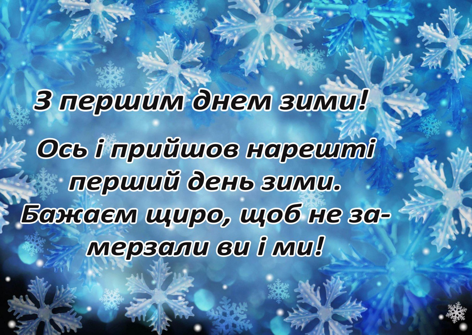 Вітаю з першим днем зими! Бажаю свіжих емоцій, казкового настрою, захоплення, радості, затишку, тепла, зворушливих моментів і відчуття свята! Будьте ближче до дорогих людей, даруйте любов і насолоджуйтесь спілкуванням в приємній компанії!
