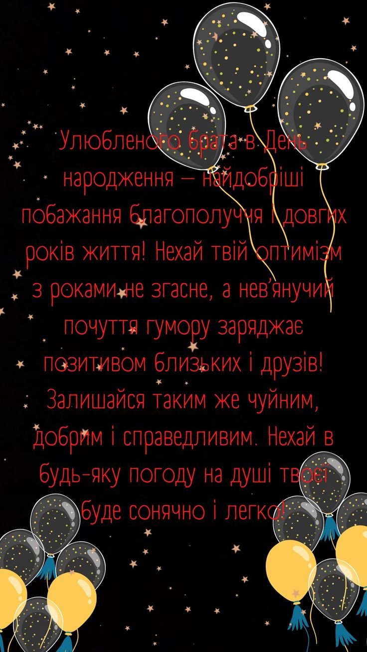 З днем народження, дорогий братик. Бажаю тобі приємних сюрпризів від долі, впевнених дій і правильних рішень від себе, вірної підтримки від друзів, міцного кохання від близьких, доброго здоров’я і вагомої частки везіння від життя.
