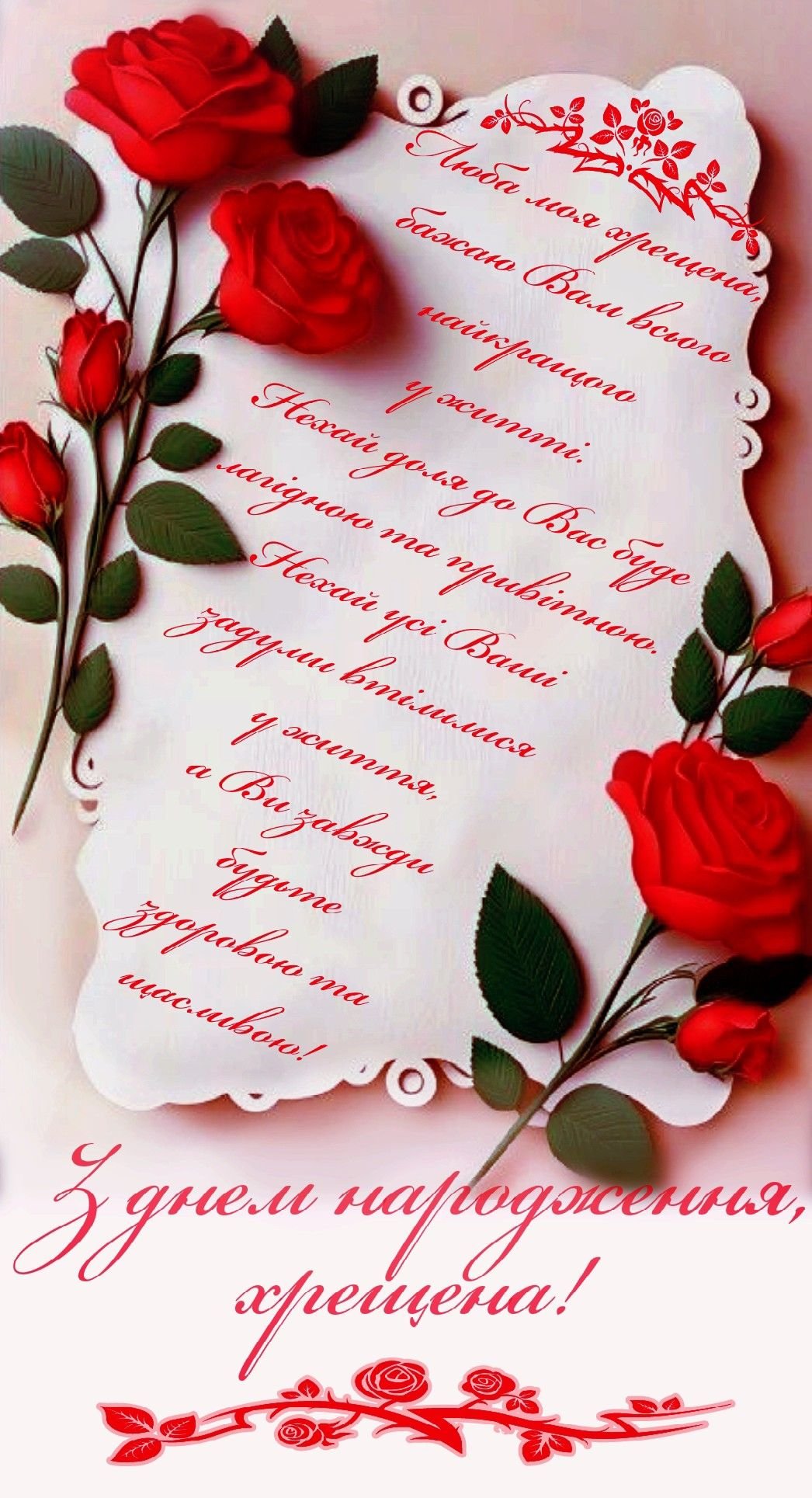 З днем народження, моя чудова хрещениця. Хочу побажати завжди мріяти і сподіватися на щось хороше, постійно прагнути до високих цілей і своїх ідеалів, ніколи не сумніватися в собі та своїх силах, залишатися постійною володаркою права на щастя і успіх.