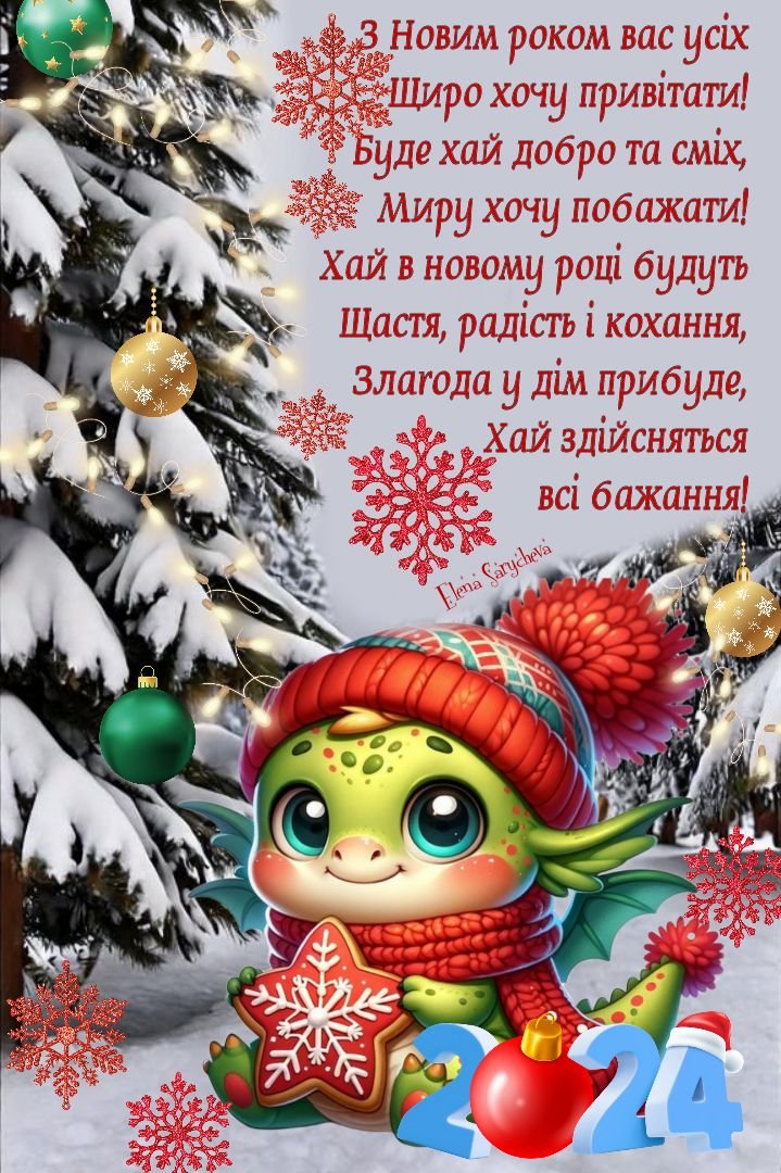 З Новим роком! Нехай цей рік принесе море щастя, удачі, тепла та світла. Хай він буде сповнений яскравих емоцій, радісних подій і приємних моментів. Бажаю здоров’я, краси, любові та успіхів!